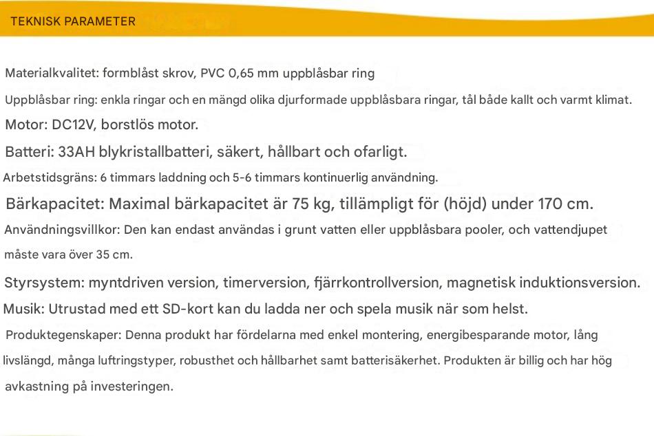 Märke: Fwu-longModell: FLBB-10001Motor: 12 volt, utan borsteBatteri: 12v 33AHPaketvikt: 33 kg (inklusive batteri)Paketstorlek: 126*68*33 cmKapacitet: Maxlastvikt 75 kg